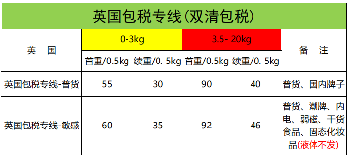 为响应客户需求还开通了英国专线,专线分普货和敏感货,可接普货、带电、弱磁、化妆品、干货食品、固态化妆品(液体不发)。包裹重量限制在20kg内