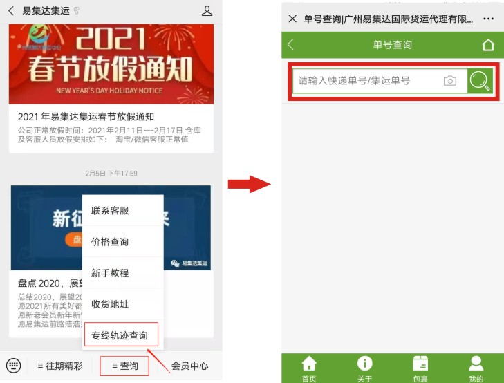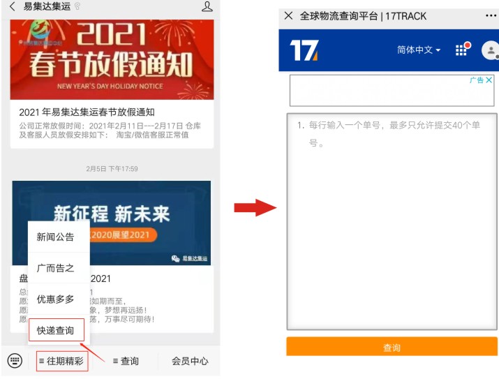 为了方便客户能够更便捷的查询快递,易集达在客户公众号上也有查询渠道