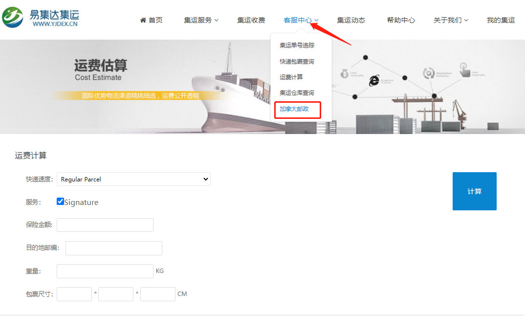 点击“客服中心”--选择“加拿大邮政”--填写相关内容(目的地邮编、重量、包裹尺寸),点击“计算”即可